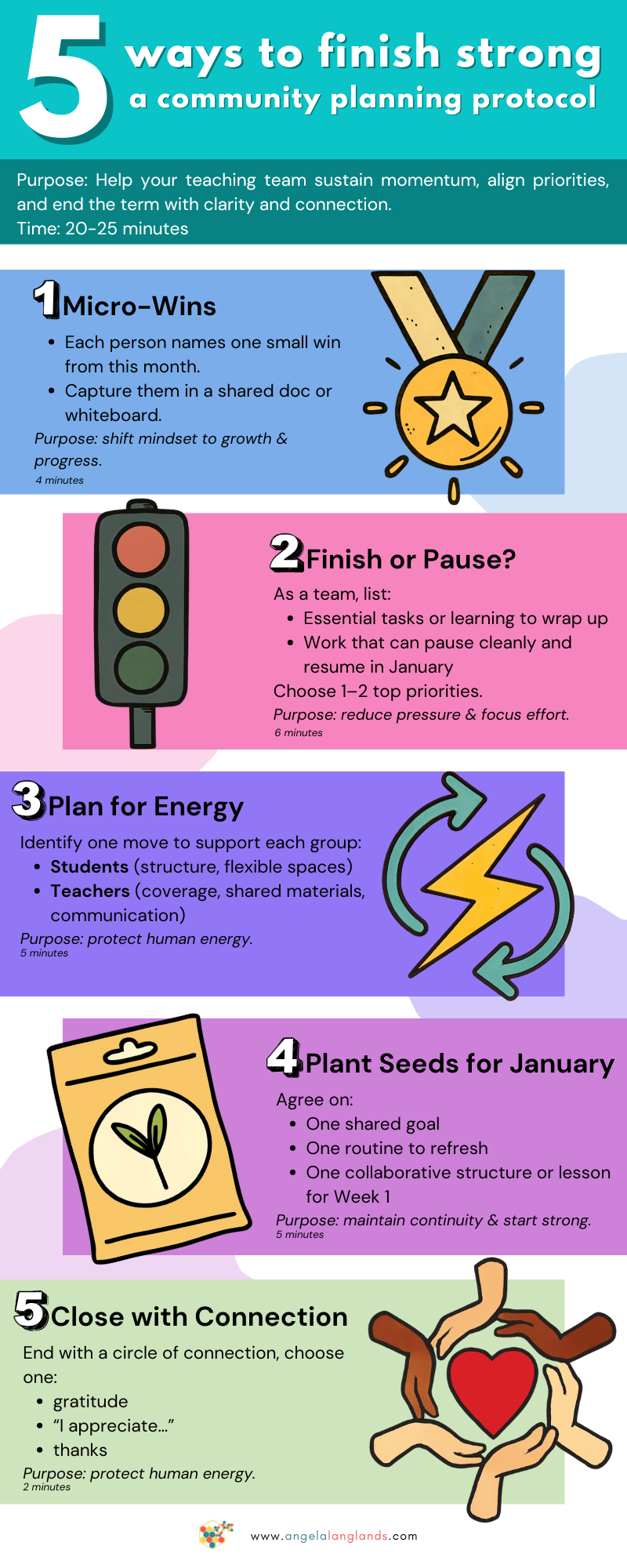 5 Ways to Finish Strong is a simple, one-page tool designed to help teaching teams keep momentum in those final days before a long break. It offers quick, realistic strategies that support focus, calm, and community—so you can wrap up learning with confidence and start the new year with clarity.
